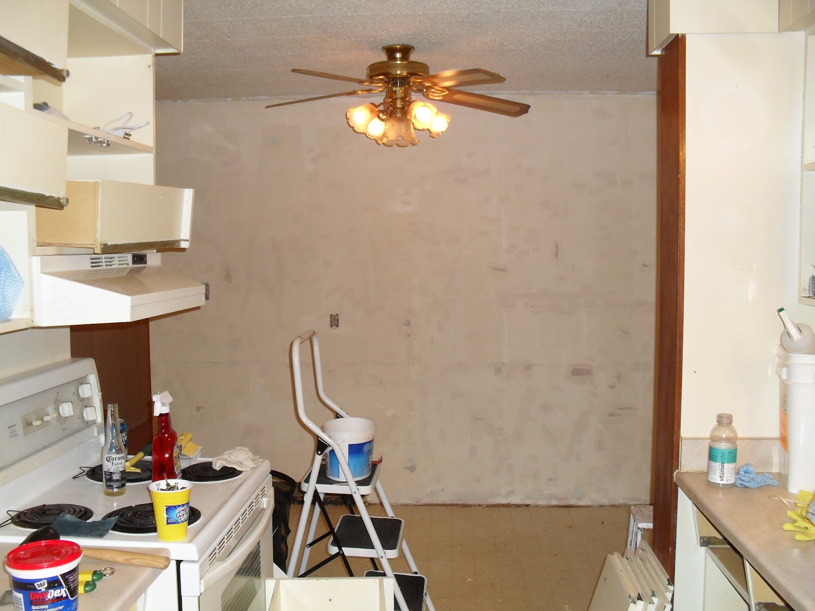 Ahhhhh, isn't that better? New ceiling fan, Kaid on the wall. That there is the cleanest stove you've ever seen! It's pretty amazing what you can clean with baking soda and vinegar! Still rocking the dusty rose counter tops. Barf.